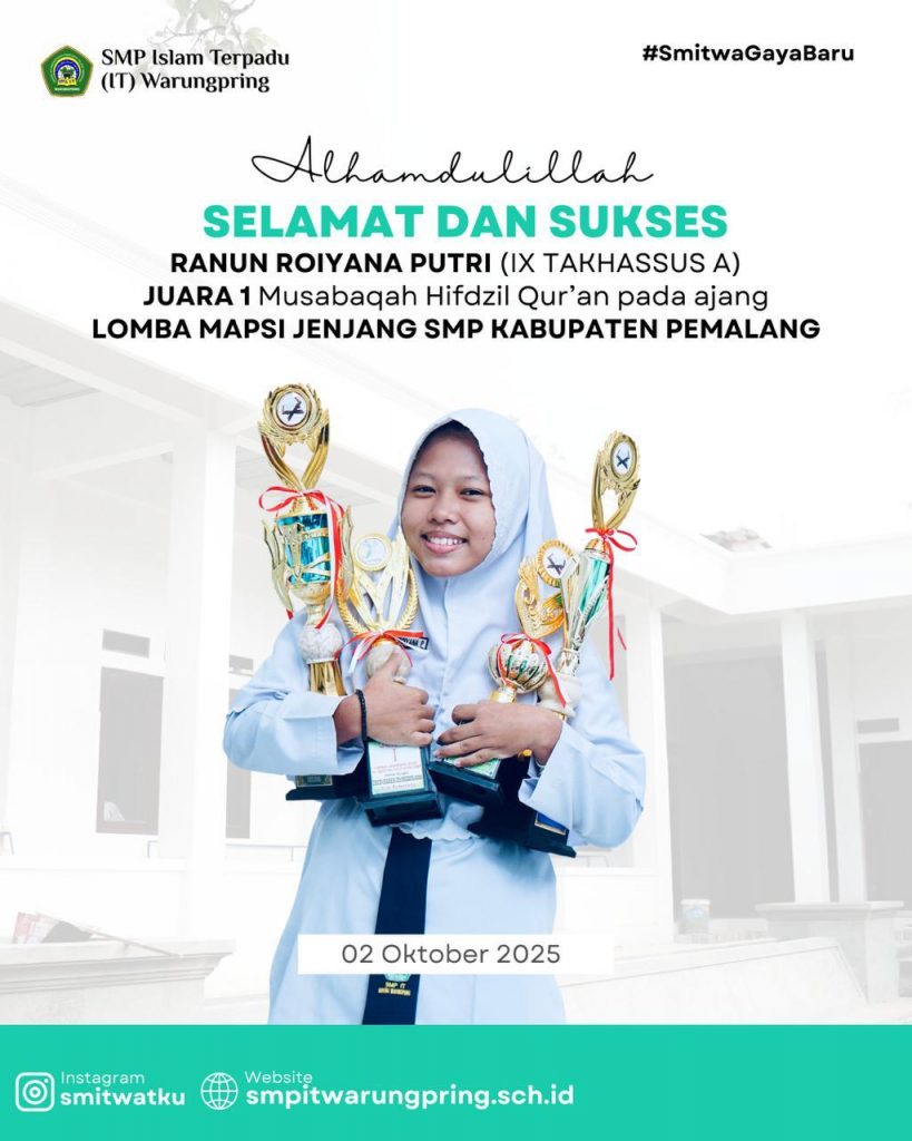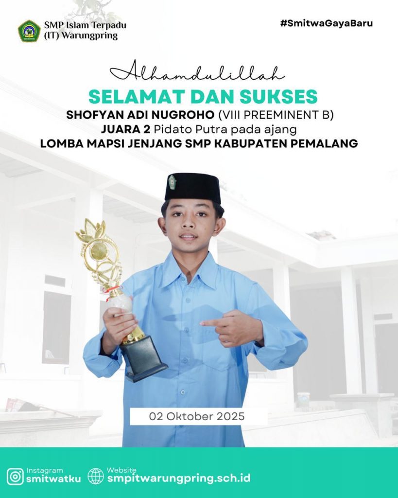 SMP IT Warungpring kembali membuktikan diri sebagai salah satu sekolah dengan konsistensi prestasi terbaik dalam bidang keagamaan dan seni Islami. Pada gelaran MAPSI (Mata Pelajaran dan Seni Islami) Kabupaten Pemalang 2025, para siswa berhasil membawa pulang sejumlah penghargaan bergengsi yang sekaligus memperpanjang tradisi juara sekolah dalam ajang tersebut.