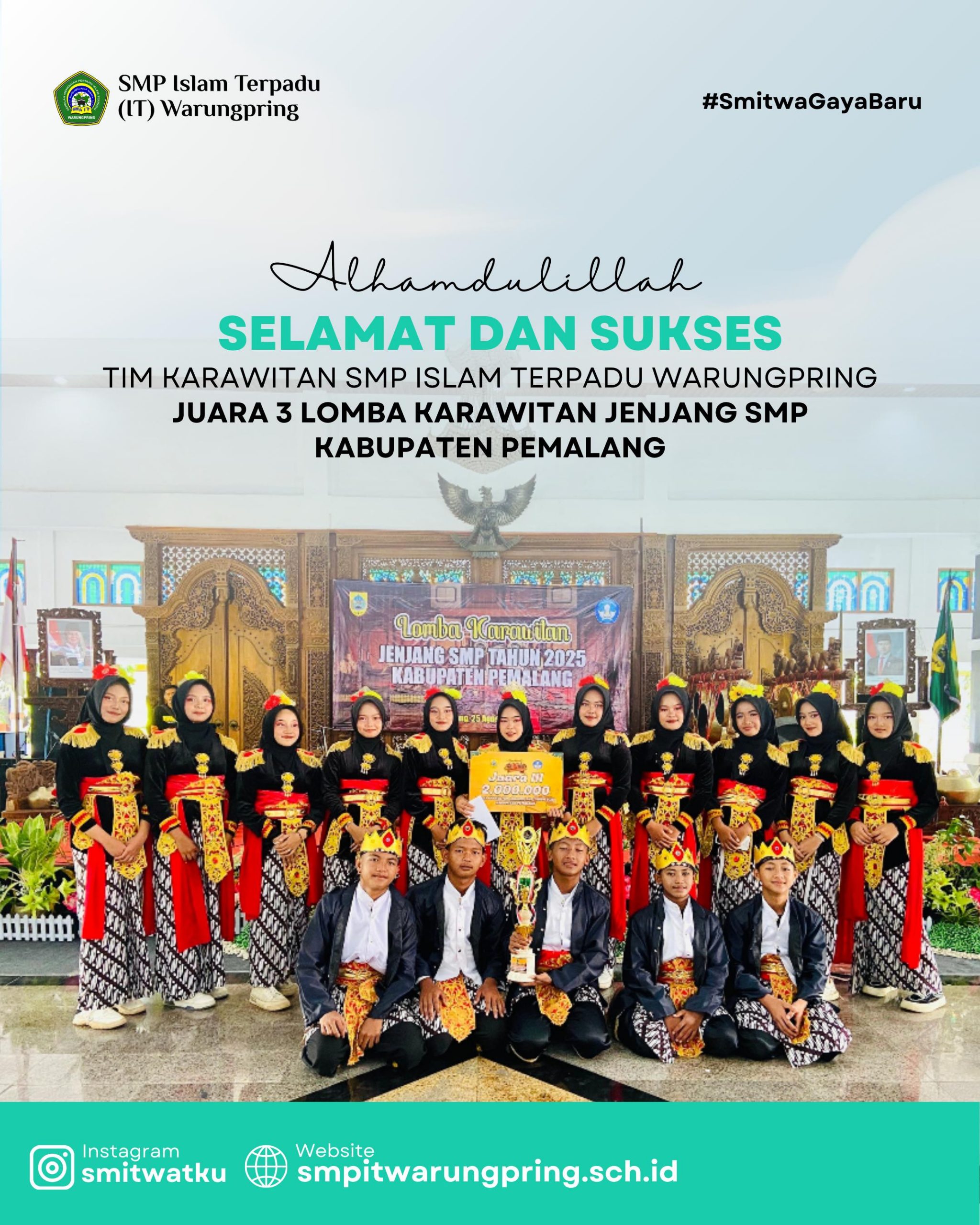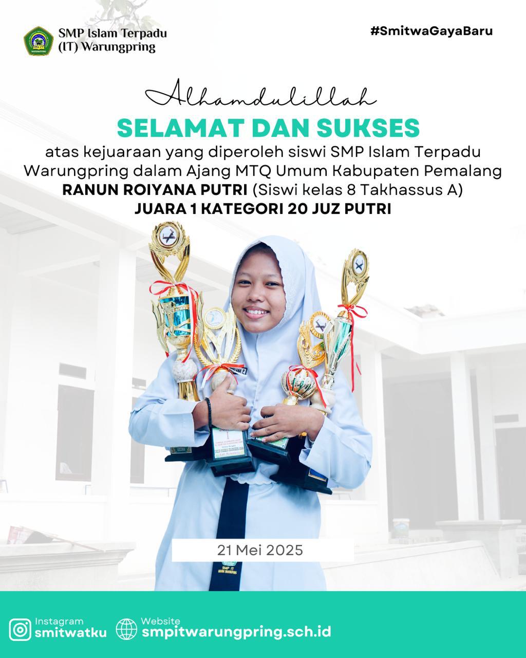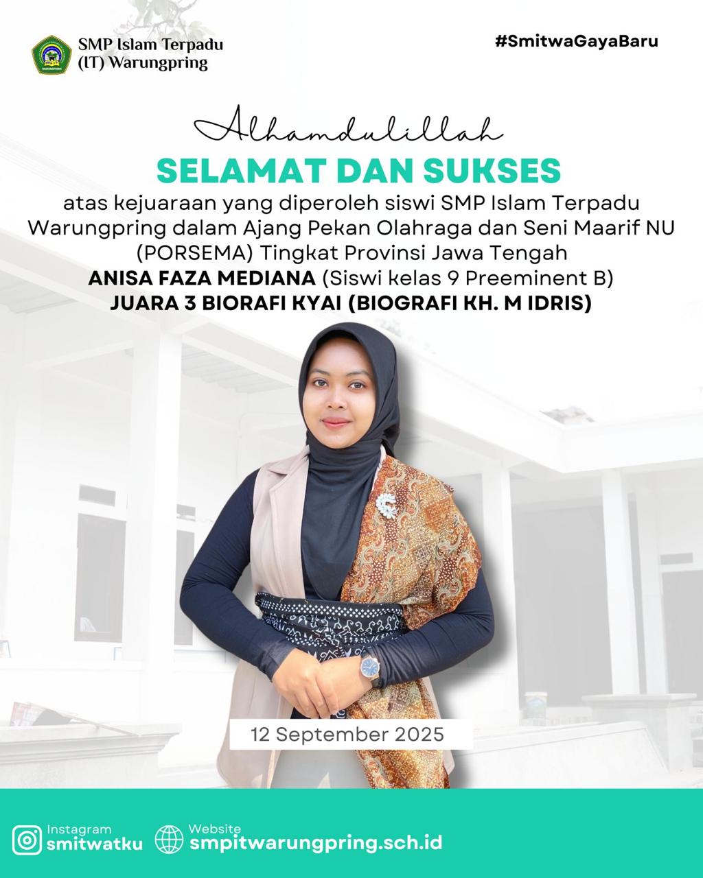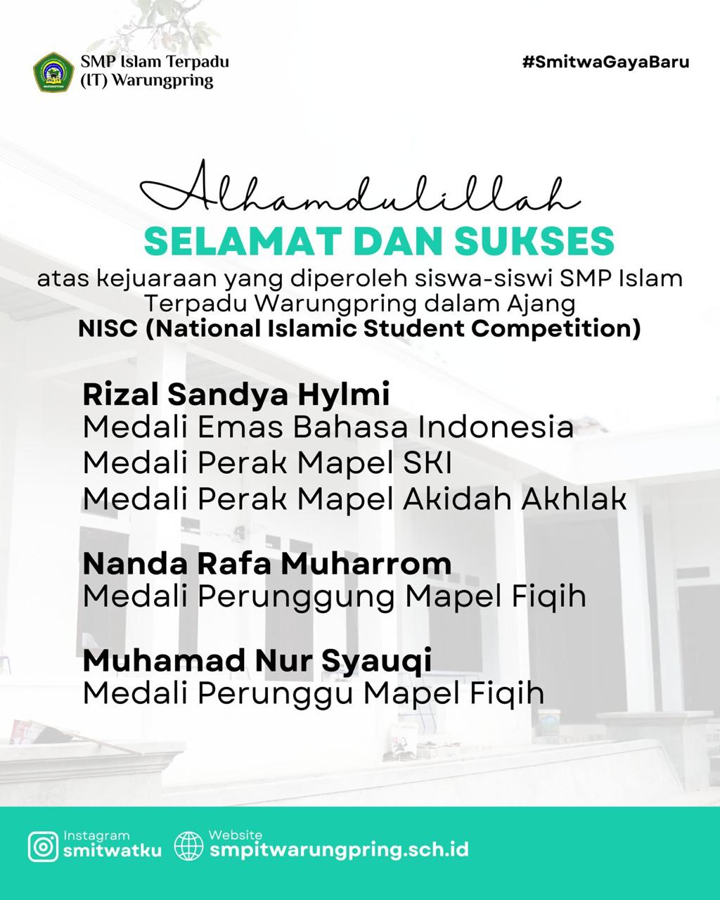 WARUNGPRING – Prestasi luar biasa kembali ditorehkan oleh santri SMP Islam Terpadu (IT) Warungpring di kancah nasional. Muhammad Sabiq Ibrahim, siswa kelas 9 Preeminent B, berhasil meraih kemenangan besar dalam ajang OSN-HP 2025 Tingkat Nasional yang diumumkan pada 2 Desember 2025. Sabiq sukses memborong tiga penghargaan sekaligus, yaitu: Pencapaian ini menunjukkan kualitas santri SMP IT … Read more